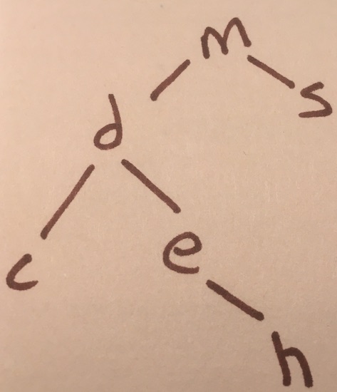 The preorder traversal of this tree -- on a single line is -- m d c e h s. Your toString function should return: